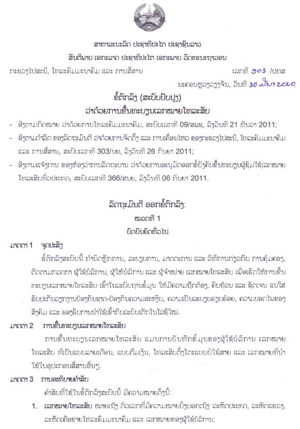 ຂໍ້ຕົກລົງ ວ່າດ້ວຍການ ຂື້ນທະບຽນ ເລກໝາຍໂທລະສັບ