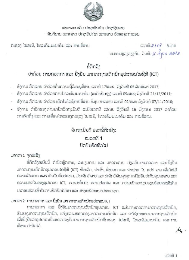 ຂໍ້ຕົກລົງສະບັບນີ້ ກຳນົດຫຼັກການ, ລະບຽບການ ແລະ ມາດຕະການ ກ່ຽວກັບ ການກວດກາ ແລະ ຢັ້ງຢືນ ມາດຕະຖານ ເຕັກນິກ ອຸປະກອນ ໄອຊີທີ (ICT) ທີ່ຜະລິດ, ນຳເຂົ້າ, ສົ່ງອອກ ແລະ ຈຳໜ່າຍ ໃນ ສປປ ລາວ ເພື່ອໃຫ້ມີຄວາມ ເອກະພາບກັນ ໃນທົ່ວປະເທດ, ມີປະສິດທິພາບ ແລະ ປະສິດທິຜົນສູງສຸດ ແນໃສ່ ຮັບປະກັນ ຄຸນນະພາບ ແລະ ຄວາມປອດໄພ ຂອງອຸປະກອນ ICT, ຄວາມໝັ້ນຄົງ ຄວາມປອດໄພ ແລະ ຄວາມເປັນລະບຽບ ຮຽບຮ້ອຍ ຂອງສັງຄົມ ປະກອບສ່ວນ ເຂົ້າໃນການ ປົກປັກຮັກສາ ແລະ ສ້າງສາ ພັດທະນາ ປະເທດຊາດ.