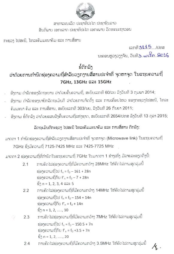ຂໍ້ຕົກລົງ ຂໍ້ຕົກລົງ ວ່າດ້ວຍ ການກໍານົດ ຊ່ອງຄື້ນຄວາມຖີ່ ສໍາລັບ ວຽກງານສື່ສານປະຈໍາທີ່ ຈຸດຫາຈຸດ ໃນແຖບຄວາມຖີ່ 7GHz, 13GHz, 15GHz ໂດຍ phommasy 08/06/2023 08/06/2023 19 ກຳນົດຊ່ອງຄວາມຖີ່ ສຳລັບ ວຽກງານສື່ສານ ປະຈຳທີ່ ຈຸດຫາຈຸດ (Microwave link) ໃນແຖບຄວາມຖີ່ 7GHz ຊຶ່ງມີຄວາມຖີ່ 7125-7425 MHz ແລະ 7425-7725 MHz. ຂໍ້ຕົກລົງ ວ່າດ້ວຍ ການກໍານົດ ຊ່ອງຄື້ນຄວາມຖີ່ ສໍາລັບ ວຽກງານສື່ສານປະຈໍາທີ່ ຈຸດຫາຈຸດ ໃນແຖບຄວາມຖີ່ 7GHz, 13GHz, 15GHz ຫົວຂໍ້ດາວໂຫຼດຂໍ້ຕົກລົງ ວ່າດ້ວຍ ການກໍານົດ ຊ່ອງຄື້ນຄວາມຖີ່ ສໍາລັບ ວຽກງານສື່ສານປະຈໍາທີ່ ຈຸດຫາຈຸດ ໃນແຖບຄວາມຖີ່ 7GHz, 13GHz, 15GHz 0 FacebookTwitterWhatsappLINEEmail ຂ່າວສານທີ່ກ່ຽວຂ້ອງ ຂໍ້ຕົກລົງ ວ່າດ້ວຍ ການຄຸ້ມຄອງ ແລະ ນຳໃຊ້ລະບົບ ຈົດໝາຍເອເລັກໂຕຣນິກ ຂອງພາກລັດ E-Mail 11/06/2023 ຂໍ້ຕົກລົງ ວ່າດ້ວຍ ການຄຸ້ມຄອງ ແລະ ນຳໃຊ້ ລະບົບກອງປະຊຸມທາງໄກ ຂອງລັດຖະບານ (Video... 11/06/2023 ຂໍ້ຕົກລົງ ວ່າດ້ວຍ ລະບົບຫ້ອງການທັນສະໄໝ e-office 11/06/2023 ຂໍ້ຕົກລົງ ວ່າດ້ວຍ ລະບົບເຄືອຂ່າຍ ອິນເຕີເນັດຂອງ ກຕສ 11/06/2023 ຂໍ້ຕົກລົງ ວ່າດ້ວຍ ລະບົບການສື່ສານ ພາກລັດ G-chat 11/06/2023 ຂໍ້ຕົກລົງ ວ່າດ້ວຍ ມາດຕະຖານ ເຕັກນິກເວັບໄຊ ຂອງພາກລັດ 11/06/2023 ຂໍ້ຕົກລົງ ວ່າດ້ວຍ ມາດຕະຖານເຕັກນິກ ການເຊື່ອມໂຍງຂໍ້ມູນ 11/06/2023 ຂໍ້ຕົກລົງ ວ່າດ້ວຍ ການຈັດເກັບ ແລະ ນຳໃຊ້ ເອກະສານຮ່ວມກັນ G-share G-drive 11/06/2023 ຂໍ້ຕົກລົງ ວ່າດ້ວຍ ການຮັບຮອງເອົາ ແຖບຄວາມຖີ່ວິທະຍຸສື່ສານ 4900 MHz ເປັນແຖບຄວາມຖີ່ ສໍາລັບ... 08/06/2023 ຂໍ້ຕົກລົງ ວ່າດ້ວຍ ການຮັບຮອງເອົາ ແຖບຄວາມຖີ່ວິທະຍຸສື່ສານ 3700-3800 MHz 08/06/2023
