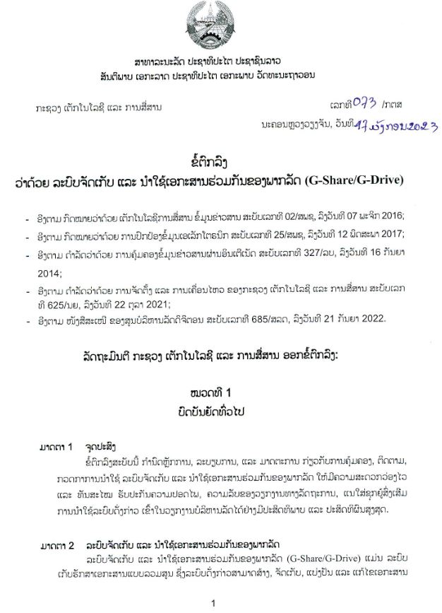 ຂໍ້ຕົກລົງ ວ່າດ້ວຍ ການຈັດເກັບ ແລະ ນຳໃຊ້ ເອກະສານຮ່ວມກັນ G-share G-drive