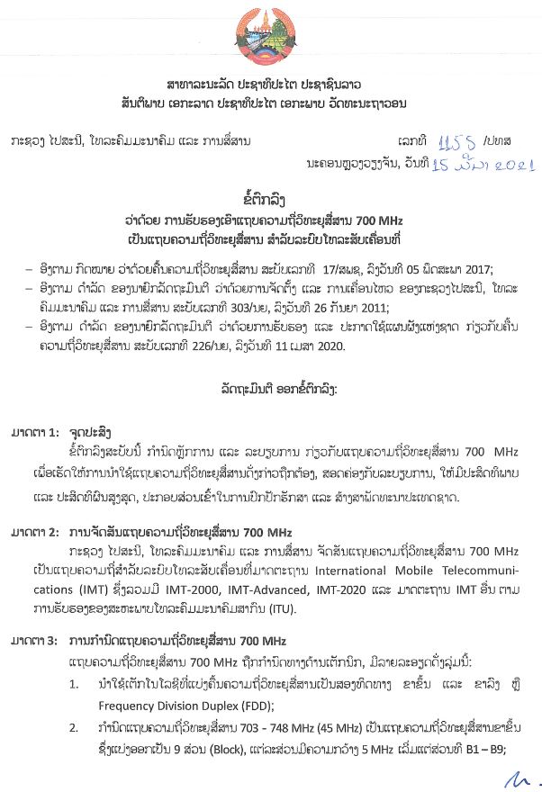 ຂໍ້ຕົກລົງ ວ່າດ້ວຍ ການຮັບຮອງເອົາ ແຖບຄວາມຖີ່ວິທະຍຸສື່ສານ 700 MHz