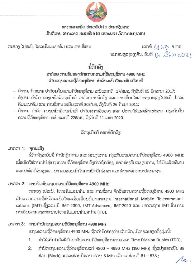| ຂໍ້ຕົກລົງ ວ່າດ້ວຍ ການຮັບຮອງເອົາ ແຖບຄວາມຖີ່ວິທະຍຸສື່ສານ 4900 MHz ເປັນແຖບຄວາມຖີ່ ສໍາລັບ ໂທລະສັບເຄື່ອນທີ່ |