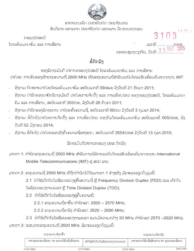 ກຳນົດແຖບຄວາມຖີ່ 2600 MHz, 1800 MHz, 700 MHz, 2100 MHz, 450 MHz, 900 MHz, 2300 MHz ສຳລັບ ການບໍລິການ ລະບົບ ໂທລະສັບເຄື່ອນທີ່ ມາດຕະຖານ International Mobile Telecommunications (IMT) ຢູ່ ສປປ ລາວ.