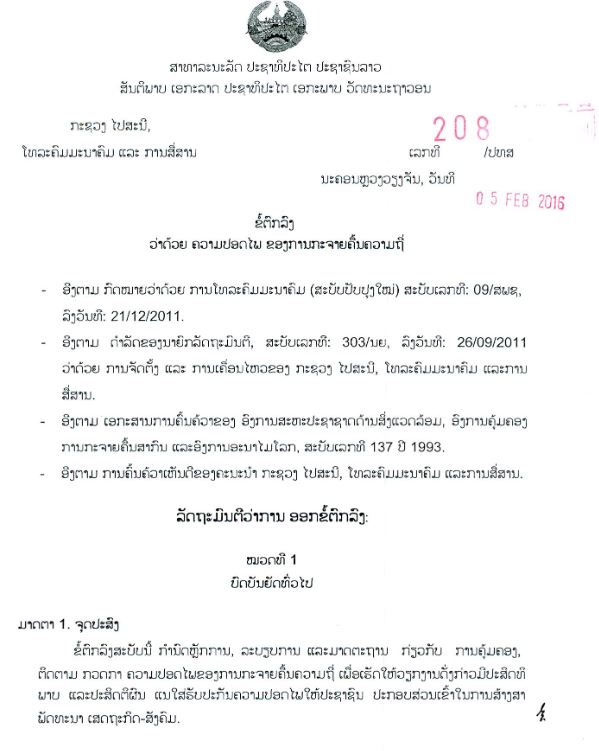 ຂໍ້ຕົກລົງສະບັບນີ້ ກຳນົດຫຼັກການ, ລະບຽບການ ແລະ ມາດຕະຖານ ກ່ຽວກັບ ການຄຸ້ມຄອງ, ຕິດຕາມ ກວດກາ ຄວາມປອດໄພ ຂອງການກະຈາຍ ຄື້ນຄວາມຖີ່ ເພື່ອເຮັດໃຫ້ ວຽກງານດັ່ງກ່າວ ມີປະສິດທິພາບ ແລະ ປະສິດທິຜົນ ແນໃສ່ ຮັບປະກັນ ຄວາມປອດໄພ ໃຫ້ປະຊາຊົນ ປະກອບສ່ວນ ເຂົ້າໃນການສ້າງສາ ພັດທະນາ ເສດຖະກິດ-ສັງຄົມ.