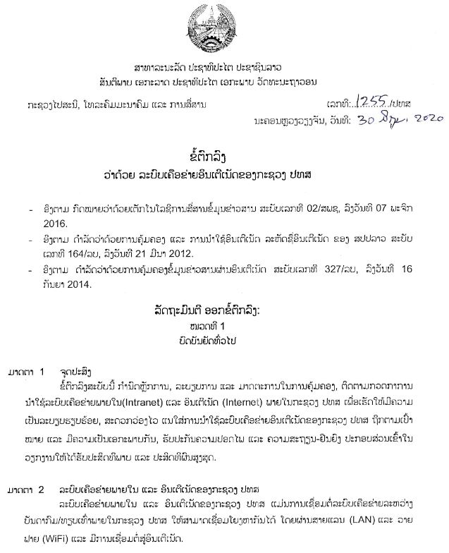 ຂໍ້ຕົກລົງ ຂໍ້ຕົກລົງ ວ່າດ້ວຍ ລະບົບເຄືອຂ່າຍ ອິນເຕີເນັດຂອງ ກຕສ ໂດຍ phommasy 11/06/2023 11/06/2023 27 ຂໍ້ຕົກລົງສະບັບນີ້ ກຳນົດຫຼັກການ, ລະບຽບການ ແລະ ມາດຕະການ ໃນການຄຸ້ມຄອງ, ຕິດຕາມ ກວດກາ ການນຳໃຊ້ ລະບົບ ເຄືອຂ່າຍພາຍໃນ (Intranet) ແລະ ອິນເຕີເນັດ (Internet) ພາຍໃນກະຊວງ ປທສ ເພື່ອເຮັດໃຫ້ ມີຄວາມເປັນລະບຽບ ຮຽບຮ້ອຍ, ສະດວກວ່ອງໄວ ແນໃສ່ ການນຳໃຊ້ ລະບົບເຄືອຂ່າຍ ອິນເຕີເນັດ ຂອງກະຊວງ ປທສ ຖືກຕາມເປົ້າໝາຍ ແລະ ມີຄວາມເປັນ ເອກະພາບກັນ, ຮັບປະກັນ ຄວາມປອດໄພ ແລະ ຄວາມສະຖຽນ-ຢືນຍົງ ປະກອບສ່ວນ ເຂົ້າໃນວຽກງານ ໃຫ້ໄດ້ຮັບ ປະສິດທິພາບ ແລະ ປະສິດທິຜົນສູງສຸດ. ຂໍ້ຕົກລົງ ວ່າດ້ວຍ ລະບົບເຄືອຂ່າຍ ອິນເຕີເນັດຂອງ ກຕສ ຫົວຂໍ້ດາວໂຫຼດຂໍ້ຕົກລົງ ວ່າດ້ວຍ ລະບົບເຄືອຂ່າຍ ອິນເຕີເນັດຂອງ ກຕສ 0 FacebookTwitterWhatsappLINEEmail ຂ່າວສານທີ່ກ່ຽວຂ້ອງ ຂໍ້ຕົກລົງ ວ່າດ້ວຍ ການຄຸ້ມຄອງ ແລະ ນຳໃຊ້ລະບົບ ຈົດໝາຍເອເລັກໂຕຣນິກ ຂອງພາກລັດ E-Mail 11/06/2023 ຂໍ້ຕົກລົງ ວ່າດ້ວຍ ການຄຸ້ມຄອງ ແລະ ນຳໃຊ້ ລະບົບກອງປະຊຸມທາງໄກ ຂອງລັດຖະບານ (Video... 11/06/2023 ຂໍ້ຕົກລົງ ວ່າດ້ວຍ ລະບົບຫ້ອງການທັນສະໄໝ e-office 11/06/2023 ຂໍ້ຕົກລົງ ວ່າດ້ວຍ ລະບົບການສື່ສານ ພາກລັດ G-chat 11/06/2023 ຂໍ້ຕົກລົງ ວ່າດ້ວຍ ມາດຕະຖານ ເຕັກນິກເວັບໄຊ ຂອງພາກລັດ 11/06/2023 ຂໍ້ຕົກລົງ ວ່າດ້ວຍ ມາດຕະຖານເຕັກນິກ ການເຊື່ອມໂຍງຂໍ້ມູນ 11/06/2023 ຂໍ້ຕົກລົງ ວ່າດ້ວຍ ການຈັດເກັບ ແລະ ນຳໃຊ້ ເອກະສານຮ່ວມກັນ G-share G-drive 11/06/2023 ຂໍ້ຕົກລົງ ວ່າດ້ວຍ ການຮັບຮອງເອົາ ແຖບຄວາມຖີ່ວິທະຍຸສື່ສານ 4900 MHz ເປັນແຖບຄວາມຖີ່ ສໍາລັບ... 08/06/2023 ຂໍ້ຕົກລົງ ວ່າດ້ວຍ ການຮັບຮອງເອົາ ແຖບຄວາມຖີ່ວິທະຍຸສື່ສານ 3700-3800 MHz 08/06/2023 ຂໍ້ຕົກລົງ ວ່າດ້ວຍ ການຮັບຮອງເອົາ ແຖບຄວາມຖີ່ວິທະຍຸສື່ສານ 3400-3600 MHz 08/06/2023
