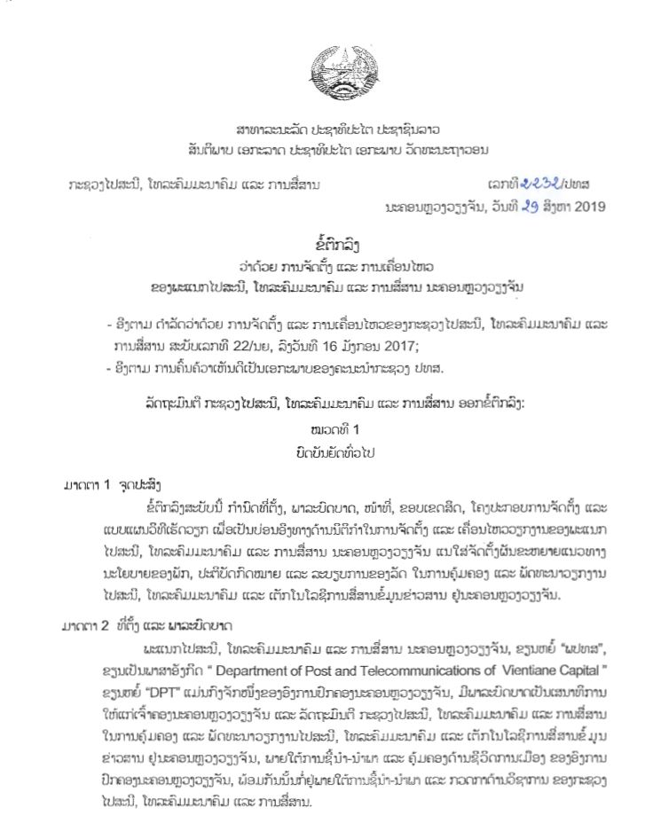 ພາລະບົດບາດ ພະແນກ ຕສ ແຂວງ ພະແນກ ນະຄອນຫລວງ ໂດຍ phommasy 06/06/2023 06/06/2023 21 ພະແນກໄປສະນີ, ໂທລະຄົມມະນາຄົມ ແລະ ການສື່ສານ ນະຄອນຫຼວງວຽງຈັນ, ຂຽນຫຍໍ້ “ພປທສ” ຂຽນເປັນພາສາອັງກິດ “Department of Post and Telecommunications of Vientiane Capital” ຂຽນຫຍໍ້ “DPT” ແມ່ນໂຄງກົງຈັກໜຶ່ງ ຂອງອົງການປົກຄອງ ນະຄອນຫຼວງວຽງຈັນ, ມີພາລະບົດບາດ ເປັນເສນາທິການ ໃຫ້ແກ່ ເຈົ້າຄອງ ນະຄອນຫຼວງວຽງຈັນ ແລະ ລັດຖະມົນຕີ ກະຊວງໄປສະນີ, ໂທລະຄົມມະນາຄົມ ແລະ ການສື່ສານ ໃນການຄຸ້ມຄອງ ແລະ ພັດທະນາ ວຽກງານໄປສະນີ, ໂທລະຄົມມະນາຄົມ ແລະ ເຕັກໂນໂລຊີ ຂໍ້ມູນຂ່າວສານ ຢູ່ນະຄອນຫຼວງວຽງຈັນ, ພາຍໃຕ້ການຊີ້ນຳ-ນຳພາ ແລະ ຄຸ້ມຄອງດ້ານ ຊີວິດການເມືອງ ຂອງອົງການ ປົກຄອງນະຄອນ ຫຼວງວຽງຈັນ, ພ້ອມກັນນັ້ນ ກໍ່ຢູ່ພາຍໃຕ້ ການຊີ້ນຳ-ນຳພາ ແລະ ກວດກາ ດ້ານວິຊາການ ຂອງກະຊວງໄປສະນີ, ໂທລະຄົມມະນາຄົມ ແລະ ການສື່ສານ. ພະແນກ ນະຄອນຫລວງ ຫົວຂໍ້ດາວໂຫຼດພະແນກ ນະຄອນຫລວງ 0 FacebookTwitterWhatsappLINEEmail ຂ່າວສານທີ່ກ່ຽວຂ້ອງ ຂໍ້ຕົກລົງວ່າດ້ວຍ ການຈັດຕັ້ງ ແລະ ເຄື່ອນໄຫວ ຂອງ ພະແນກ ເຕັກໂນໂລຊີ ແລະ... 06/06/2023 ແຂວງບໍ່ແກ້ວ 06/06/2023 ແຂວງຫຼວງນ້ຳທາ 06/06/2023 ແຂວງວຽງຈັນ 06/06/2023 ແຂວງໄຊຍະບູລີ 06/06/2023 ແຂວງໄຊສົມບູນ 06/06/2023 ແຂວງເຊກອງ 06/06/2023 ແຂວງອັດຕະປື 06/06/2023 ແຂວງອຸດົມໄຊ 06/06/2023 ແຂວງຫົວພັນ 06/06/2023