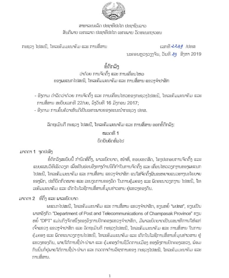 ພາລະບົດບາດ ພະແນກ ຕສ ແຂວງ ແຂວງຈຳປາສັກ ໂດຍ phommasy 06/06/2023 06/06/2023 21 ພະແນກໄປສະນີ, ໂທລະຄົມມະນາຄົມ ແລະ ການສື່ສານ ແຂວງຈຳປາສັກ, ຂຽນຫຍໍ້ “ພປທສ” ຂຽນເປັນພາສາອັງກິດ “Department of Post and Telecommunications of Champasak Province” ຂຽນຫຍໍ້ “DPT” ແມ່ນໂຄງກົງຈັກໜຶ່ງ ຂອງອົງການປົກຄອງ ແຂວງຈຳປາສັກ, ມີພາລະບົດບາດ ເປັນເສນາທິການ ໃຫ້ແກ່ ເຈົ້າແຂວງ ແຂວງຈຳປາສັກ ແລະ ລັດຖະມົນຕີ ກະຊວງໄປສະນີ, ໂທລະຄົມມະນາຄົມ ແລະ ການສື່ສານ ໃນການຄຸ້ມຄອງ ແລະ ພັດທະນາ ວຽກງານໄປສະນີ, ໂທລະຄົມມະນາຄົມ ແລະ ເຕັກໂນໂລຊີ ຂໍ້ມູນຂ່າວສານ ຢູ່ແຂວງຂອງຕົນ, ພາຍໃຕ້ການຊີ້ນຳ-ນຳພາ ແລະ ຄຸ້ມຄອງດ້ານ ຊີວິດການເມືອງ ຂອງອົງການ ປົກຄອງແຂວງ, ພ້ອມກັນນັ້ນ ກໍ່ຢູ່ພາຍໃຕ້ ການຊີ້ນຳ-ນຳພາ ແລະ ກວດກາ ດ້ານວິຊາການ ຂອງກະຊວງ ໄປສະນີ, ໂທລະຄົມມະນາຄົມ ແລະ ການສື່ສານ. ແຂວງຈຳປາສັກ ຫົວຂໍ້ດາວໂຫຼດແຂວງຈຳປາສັກ 0 FacebookTwitterWhatsappLINEEmail ຂ່າວສານທີ່ກ່ຽວຂ້ອງ ຂໍ້ຕົກລົງວ່າດ້ວຍ ການຈັດຕັ້ງ ແລະ ເຄື່ອນໄຫວ ຂອງ ພະແນກ ເຕັກໂນໂລຊີ ແລະ... 06/06/2023 ແຂວງບໍ່ແກ້ວ 06/06/2023 ແຂວງຫຼວງນ້ຳທາ 06/06/2023 ແຂວງວຽງຈັນ 06/06/2023 ແຂວງໄຊຍະບູລີ 06/06/2023 ແຂວງໄຊສົມບູນ 06/06/2023 ແຂວງເຊກອງ 06/06/2023 ແຂວງອັດຕະປື 06/06/2023 ແຂວງອຸດົມໄຊ 06/06/2023 ແຂວງຫົວພັນ 06/06/2023