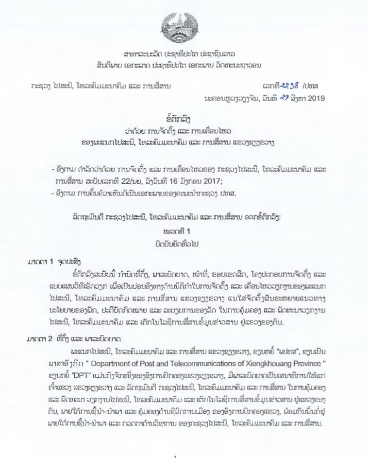 ພາລະບົດບາດ ພະແນກ ຕສ ແຂວງ ແຂວງຊຽງຂວາງ ໂດຍ phommasy 06/06/2023 06/06/2023 25 ພະແນກໄປສະນີ, ໂທລະຄົມມະນາຄົມ ແລະ ການສື່ສານ ແຂວງຊຽງຂວາງ, ຂຽນຫຍໍ້ “ພປທສ” ຂຽນເປັນພາສາອັງກິດ “Department of Post and Telecommunications of Xiengkhouang Province” ຂຽນຫຍໍ້ “DPT” ແມ່ນໂຄງກົງຈັກໜຶ່ງ ຂອງອົງການປົກຄອງ ແຂວງຊຽງຂວາງ, ມີພາລະບົດບາດ ເປັນເສນາທິການ ໃຫ້ແກ່ ເຈົ້າແຂວງ ແຂວງຊຽງຂວາງ ແລະ ລັດຖະມົນຕີ ກະຊວງໄປສະນີ, ໂທລະຄົມມະນາຄົມ ແລະ ການສື່ສານ ໃນການຄຸ້ມຄອງ ແລະ ພັດທະນາ ວຽກງານໄປສະນີ, ໂທລະຄົມມະນາຄົມ ແລະ ເຕັກໂນໂລຊີ ຂໍ້ມູນຂ່າວສານ ຢູ່ແຂວງຂອງຕົນ, ພາຍໃຕ້ການຊີ້ນຳ-ນຳພາ ແລະ ຄຸ້ມຄອງດ້ານ ຊີວິດການເມືອງ ຂອງອົງການ ປົກຄອງແຂວງ, ພ້ອມກັນນັ້ນ ກໍ່ຢູ່ພາຍໃຕ້ ການຊີ້ນຳ-ນຳພາ ແລະ ກວດກາ ດ້ານວິຊາການ ຂອງກະຊວງ ໄປສະນີ, ໂທລະຄົມມະນາຄົມ ແລະ ການສື່ສານ. ແຂວງຊຽງຂວາງ ຫົວຂໍ້ດາວໂຫຼດແຂວງຊຽງຂວາງ 0 FacebookTwitterWhatsappLINEEmail ຂ່າວສານທີ່ກ່ຽວຂ້ອງ ຂໍ້ຕົກລົງວ່າດ້ວຍ ການຈັດຕັ້ງ ແລະ ເຄື່ອນໄຫວ ຂອງ ພະແນກ ເຕັກໂນໂລຊີ ແລະ... 06/06/2023 ແຂວງບໍ່ແກ້ວ 06/06/2023 ແຂວງຫຼວງນ້ຳທາ 06/06/2023 ແຂວງວຽງຈັນ 06/06/2023 ແຂວງໄຊຍະບູລີ 06/06/2023 ແຂວງໄຊສົມບູນ 06/06/2023 ແຂວງເຊກອງ 06/06/2023 ແຂວງອັດຕະປື 06/06/2023 ແຂວງອຸດົມໄຊ 06/06/2023 ແຂວງຫົວພັນ 06/06/2023