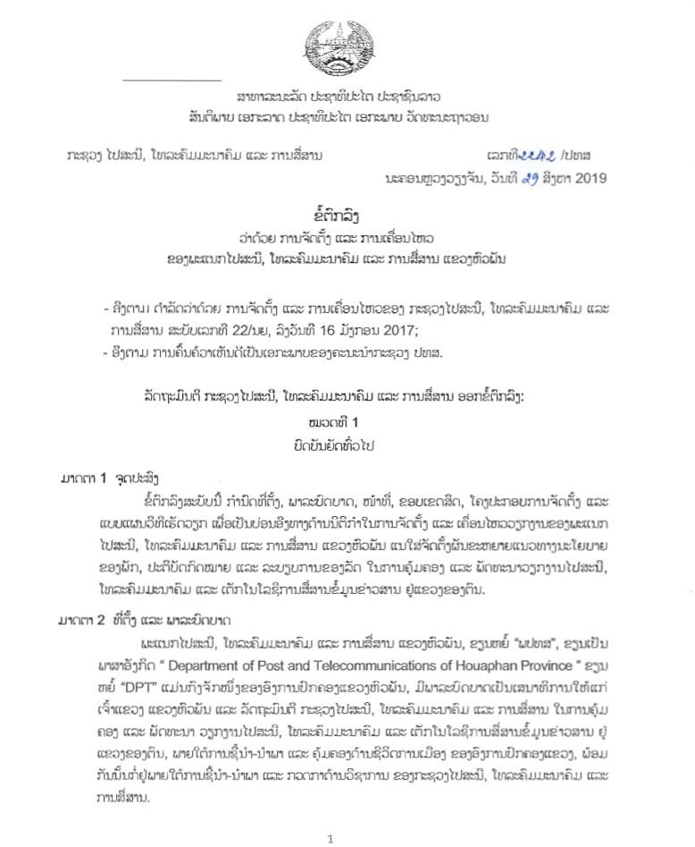 ພາລະບົດບາດ ພະແນກ ຕສ ແຂວງ ແຂວງຫົວພັນ ໂດຍ phommasy 06/06/2023 06/06/2023 19 ພະແນກໄປສະນີ, ໂທລະຄົມມະນາຄົມ ແລະ ການສື່ສານ ແຂວງຫົວພັນ, ຂຽນຫຍໍ້ “ພປທສ” ຂຽນເປັນພາສາອັງກິດ “Department of Post and Telecommunications of Houaphan Province” ຂຽນຫຍໍ້ “DPT” ແມ່ນໂຄງກົງຈັກໜຶ່ງ ຂອງອົງການປົກຄອງ ແຂວງຫົວພັນ, ມີພາລະບົດບາດ ເປັນເສນາທິການ ໃຫ້ແກ່ ເຈົ້າແຂວງ ແຂວງຫົວພັນ ແລະ ລັດຖະມົນຕີ ກະຊວງໄປສະນີ, ໂທລະຄົມມະນາຄົມ ແລະ ການສື່ສານ ໃນການຄຸ້ມຄອງ ແລະ ພັດທະນາ ວຽກງານໄປສະນີ, ໂທລະຄົມມະນາຄົມ ແລະ ເຕັກໂນໂລຊີ ຂໍ້ມູນຂ່າວສານ ຢູ່ແຂວງຂອງຕົນ, ພາຍໃຕ້ການຊີ້ນຳ-ນຳພາ ແລະ ຄຸ້ມຄອງດ້ານ ຊີວິດການເມືອງ ຂອງອົງການ ປົກຄອງແຂວງ, ພ້ອມກັນນັ້ນ ກໍ່ຢູ່ພາຍໃຕ້ ການຊີ້ນຳ-ນຳພາ ແລະ ກວດກາ ດ້ານວິຊາການ ຂອງກະຊວງ ໄປສະນີ, ໂທລະຄົມມະນາຄົມ ແລະ ການສື່ສານ. ແຂວງຫົວພັນ ຫົວຂໍ້ດາວໂຫຼດແຂວງຫົວພັນ 0 FacebookTwitterWhatsappLINEEmail ຂ່າວສານທີ່ກ່ຽວຂ້ອງ ຂໍ້ຕົກລົງວ່າດ້ວຍ ການຈັດຕັ້ງ ແລະ ເຄື່ອນໄຫວ ຂອງ ພະແນກ ເຕັກໂນໂລຊີ ແລະ... 06/06/2023 ແຂວງບໍ່ແກ້ວ 06/06/2023 ແຂວງຫຼວງນ້ຳທາ 06/06/2023 ແຂວງວຽງຈັນ 06/06/2023 ແຂວງໄຊຍະບູລີ 06/06/2023 ແຂວງໄຊສົມບູນ 06/06/2023 ແຂວງເຊກອງ 06/06/2023 ແຂວງອັດຕະປື 06/06/2023 ແຂວງອຸດົມໄຊ 06/06/2023 ແຂວງຫລວງພະບາງ 06/06/2023