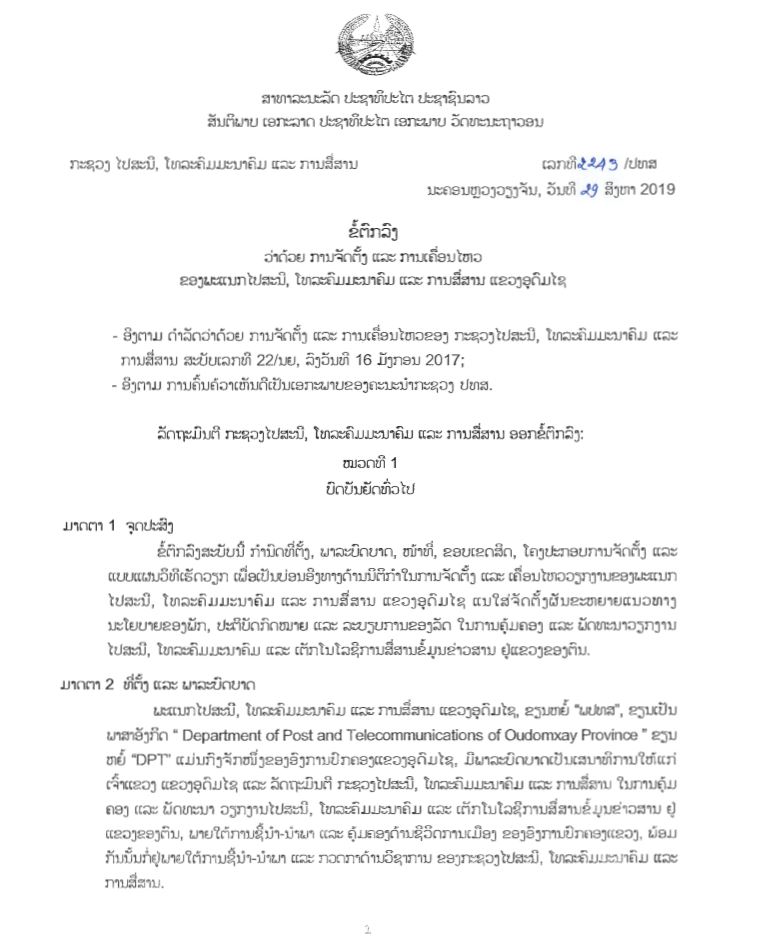 ພາລະບົດບາດ ພະແນກ ຕສ ແຂວງ ແຂວງອຸດົມໄຊ ໂດຍ phommasy 06/06/2023 06/06/2023 26 ພະແນກໄປສະນີ, ໂທລະຄົມມະນາຄົມ ແລະ ການສື່ສານ ແຂວງອຸດົມໄຊ, ຂຽນຫຍໍ້ “ພປທສ” ຂຽນເປັນພາສາອັງກິດ “Department of Post and Telecommunications of Oudomxay Province” ຂຽນຫຍໍ້ “DPT” ແມ່ນໂຄງກົງຈັກໜຶ່ງ ຂອງອົງການປົກຄອງ ແຂວງອຸດົມໄຊ, ມີພາລະບົດບາດ ເປັນເສນາທິການ ໃຫ້ແກ່ ເຈົ້າແຂວງ ແຂວງອຸດົມໄຊ ແລະ ລັດຖະມົນຕີ ກະຊວງໄປສະນີ, ໂທລະຄົມມະນາຄົມ ແລະ ການສື່ສານ ໃນການຄຸ້ມຄອງ ແລະ ພັດທະນາ ວຽກງານໄປສະນີ, ໂທລະຄົມມະນາຄົມ ແລະ ເຕັກໂນໂລຊີ ຂໍ້ມູນຂ່າວສານ ຢູ່ແຂວງຂອງຕົນ, ພາຍໃຕ້ການຊີ້ນຳ-ນຳພາ ແລະ ຄຸ້ມຄອງດ້ານ ຊີວິດການເມືອງ ຂອງອົງການ ປົກຄອງແຂວງ, ພ້ອມກັນນັ້ນ ກໍ່ຢູ່ພາຍໃຕ້ ການຊີ້ນຳ-ນຳພາ ແລະ ກວດກາ ດ້ານວິຊາການ ຂອງກະຊວງ ໄປສະນີ, ໂທລະຄົມມະນາຄົມ ແລະ ການສື່ສານ. ແຂວງອຸດົມໄຊ ຫົວຂໍ້ດາວໂຫຼດແຂວງອຸດົມໄຊ 0 FacebookTwitterWhatsappLINEEmail ຂ່າວສານທີ່ກ່ຽວຂ້ອງ ຂໍ້ຕົກລົງວ່າດ້ວຍ ການຈັດຕັ້ງ ແລະ ເຄື່ອນໄຫວ ຂອງ ພະແນກ ເຕັກໂນໂລຊີ ແລະ... 06/06/2023 ແຂວງບໍ່ແກ້ວ 06/06/2023 ແຂວງຫຼວງນ້ຳທາ 06/06/2023 ແຂວງວຽງຈັນ 06/06/2023 ແຂວງໄຊຍະບູລີ 06/06/2023 ແຂວງໄຊສົມບູນ 06/06/2023 ແຂວງເຊກອງ 06/06/2023 ແຂວງອັດຕະປື 06/06/2023 ແຂວງຫົວພັນ 06/06/2023 ແຂວງຫລວງພະບາງ 06/06/2023